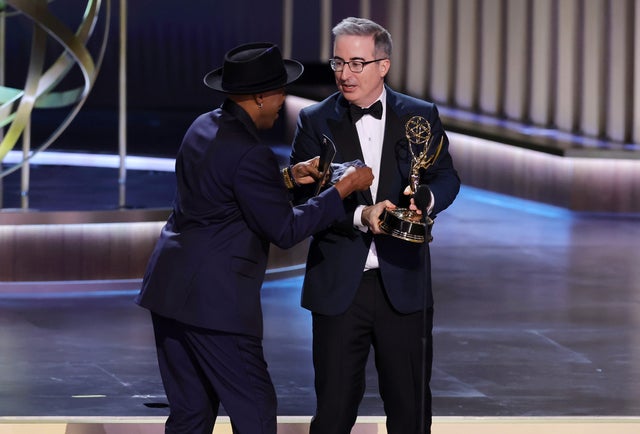 Arsenio Hall adjusts John Oliver's bowtie the Emmy for Outstanding Writing for a Variety Series.
