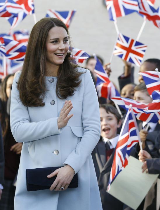 Kate was ready for spring when she visited the Royal Society of Medicine in London, England, on March 20. For the occasion, the eight-months pregnant royal donned a mint green Jenny Packham coat that connected with a bow at the collar over a sky blue dress and beige suede heels.