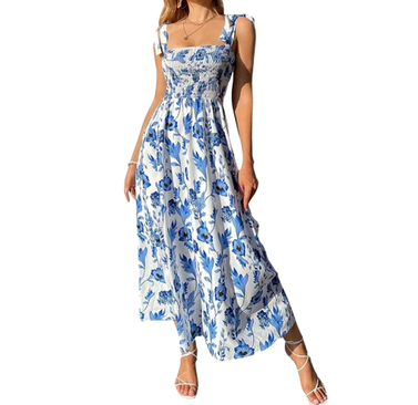 Embrace the charming cottagecore aesthetic with this floral dress, featuring spaghetti straps with tie details and a chic square neckline.